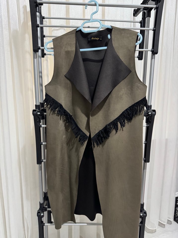 Kemerli ve püskül detaylı, kahverengi uzun süet kadın yeleği. Kolsuz, yaka detaylı, günlük rahat stil için uygundur.