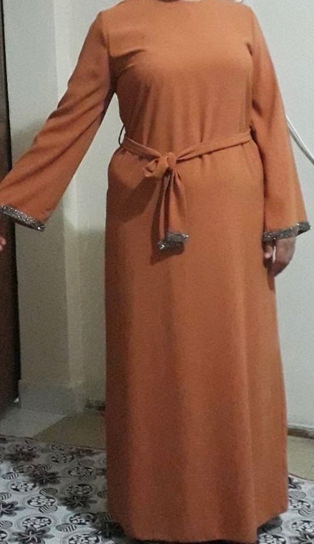 Yüksek yakalı, parlak detaylı uzun kahverengi elbise. Kemerli, bol kesim ve sentetik kumaştan, günlük kullanım için uygundur.