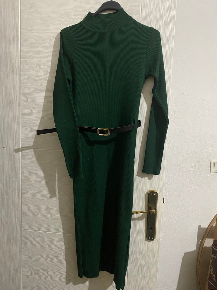 Kemerli, uzun ve dar kesim yeşil elbise, balıkçı yaka ve uzun kolludur. Yumuşak sentetik kumaştan üretilmiş, minimalist sokak stili için uygundur.