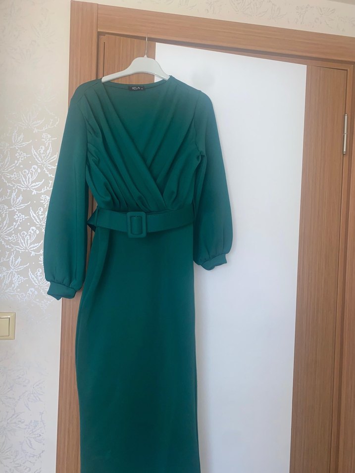 Kemer detaylı, V yaka ve uzun kollu yeşil uzun elbise. Modern klasik tarzda, ofis için uygun, sentetik dokulu kumaştan yapılmıştır. Diz altı