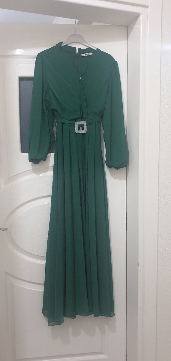 Kemerli Uzun Yeşil V Yaka Kadın Elbise
