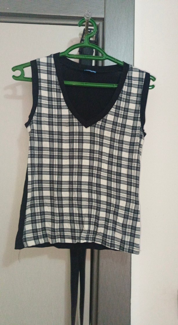 V yaka, kolsuz kadın yelek, kemerli ve ekose desenli. Gri tonlarda, günlük rahat kullanıma uygun, sentetik kumaştan üretilmiştir.