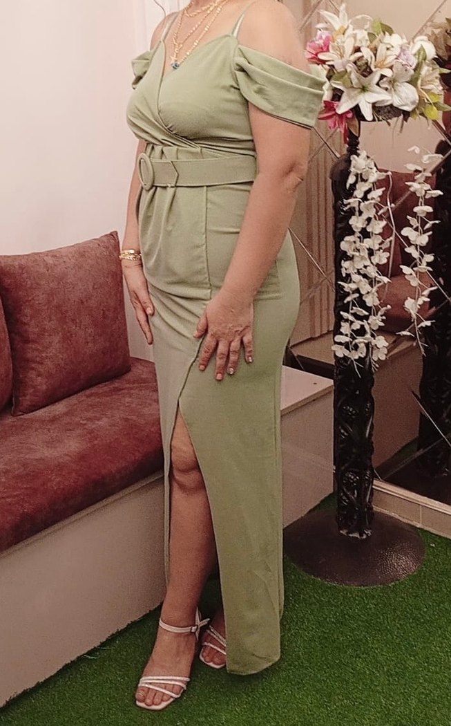 Kemer detaylı, V yaka ve askılı uzun elbise. Açık haki renkte, sentetik dokulu kumaştan, romantik akşamlar için uygun.