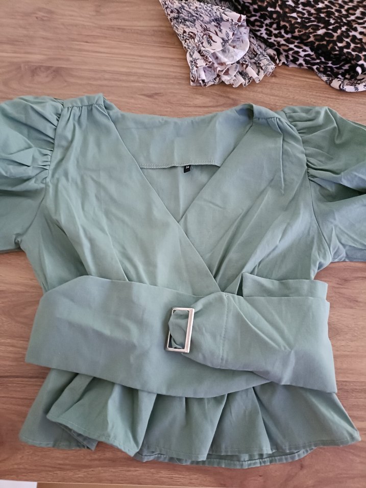 Keten kumaştan, kemerli ve V yakalı, kısa kollu, bol kesim bluz. Gri renkte, midi boyda ve desen içermeyen günlük kullanıma uygun.