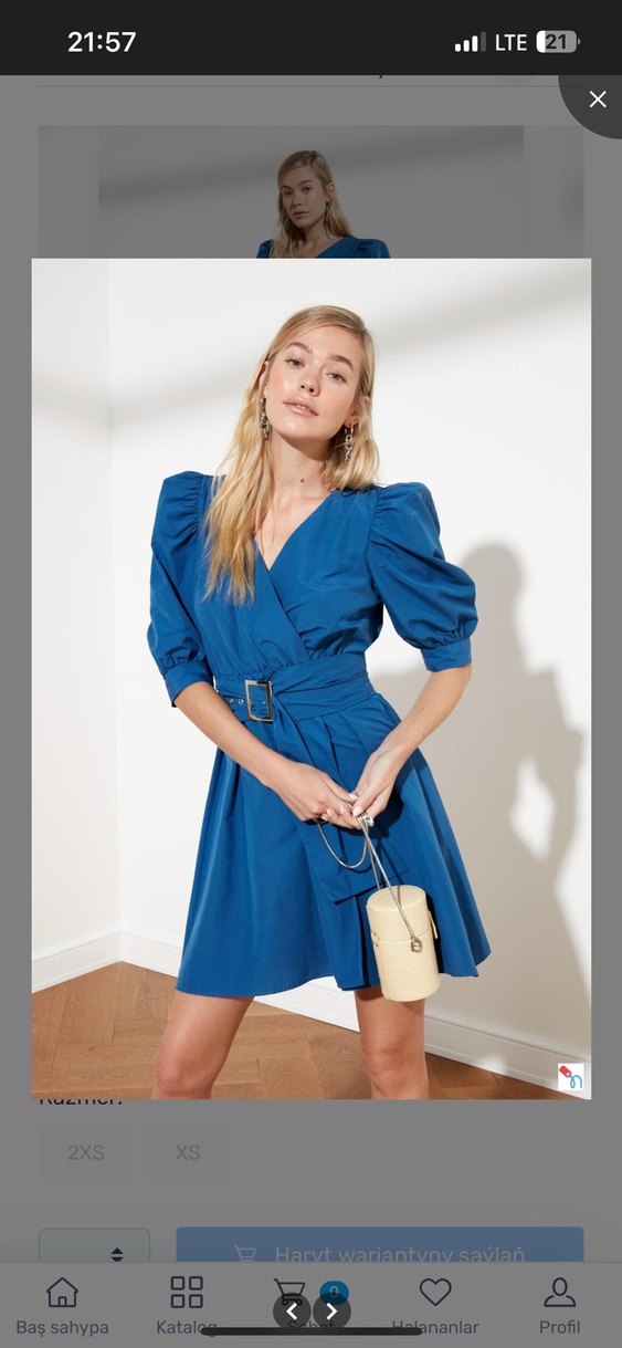 Kısa balon kollu, V yakalı lacivert mini elbise, kemerli ve bol kesimdir. Hafif batik deseni ve yumuşak sentetik kumaşıyla günlük kullanıma uygundur.