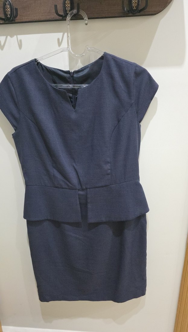 Lacivert midi elbise, V yaka, kısa kollu ve kemerli bel detayına sahiptir. Ofis kullanımı için uygun, düz ve desensiz tasarıma sahip.