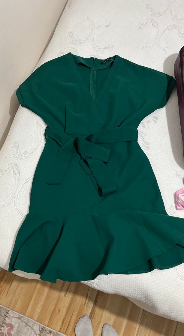 Kemerli, V yakalı, kısa kollu, yeşil midi elbise, sade tasarımlı ve salaş etek ucu ile günlük kullanıma uygundur.