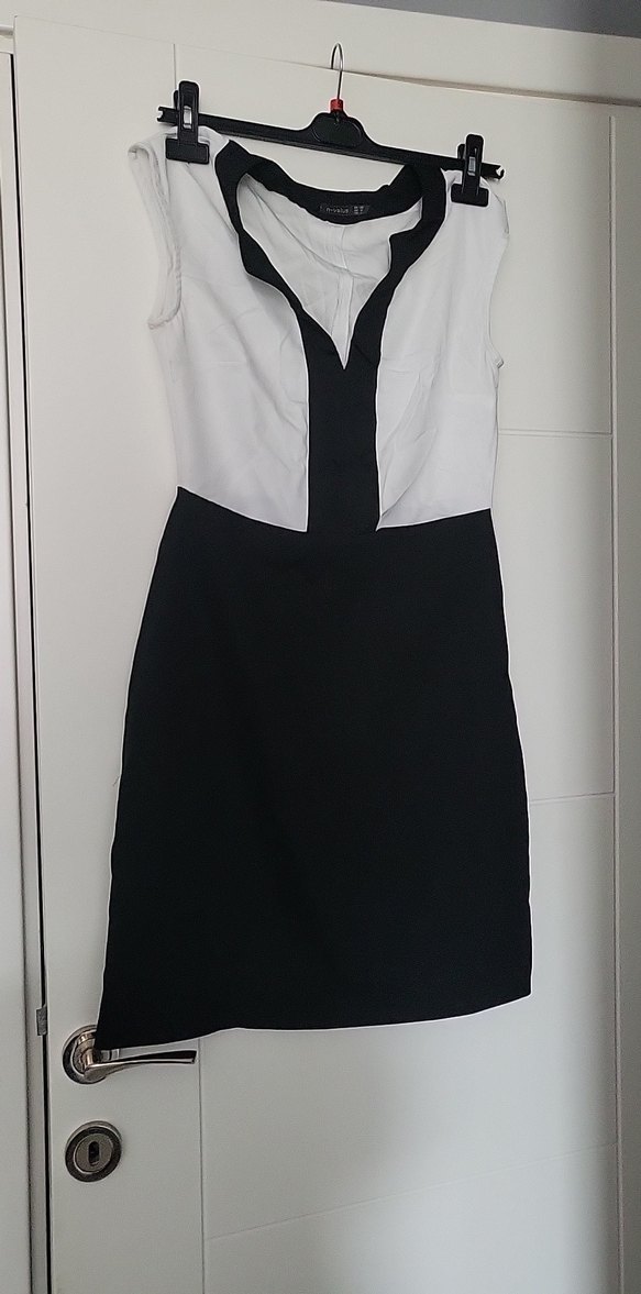 Kemerli, kolsuz ve V yakalı bu siyah beyaz midi elbise, ofis için şık ve modern bir görünüme sahiptir. 38 beden