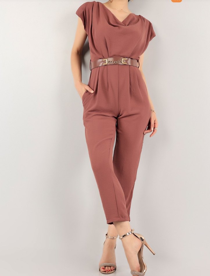Kemerli V Yaka vatkalı degaje yaka Kadın Tulum