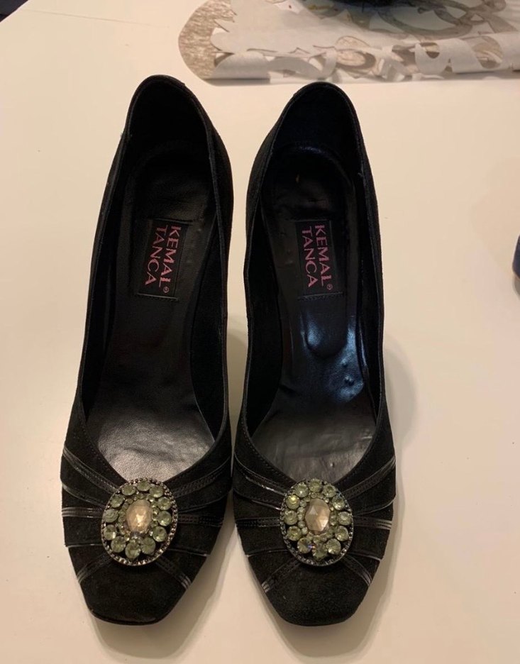 Siyah kadın ayakkabısı, dolgu topuklu, vintage desenli ve kemerli, romantik akşamlar için uygun.