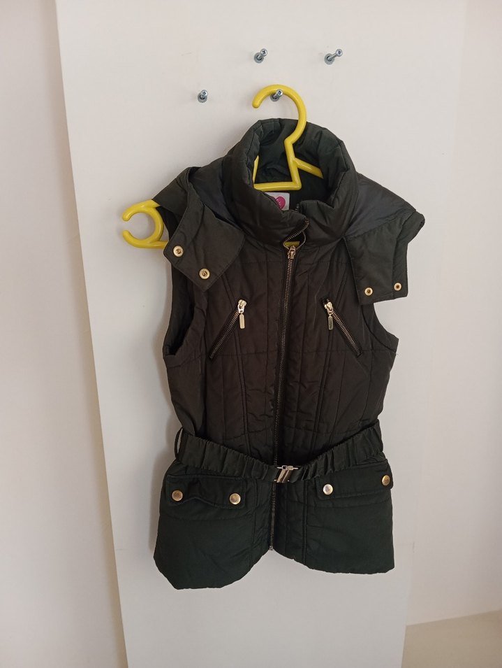 Yüksek yakalı,şapkalı, kemerli ve cep fermuarlı haki yeşil yelek.Çok az kullanıldı.Tertemiz ve yepyenidir.Kemeri çıkartılabilir.