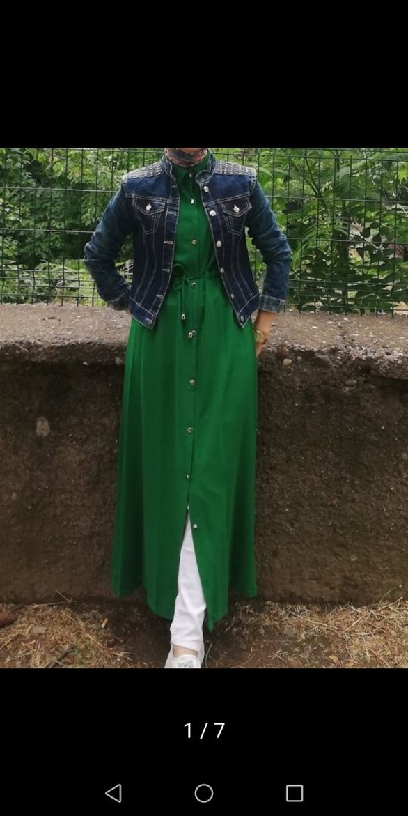 Koyu yeşil renkte, uzun elbise. Denim kumaştan, kesik yakalı ve regular fit modeldir. Günlük sokak stiline uygundur.