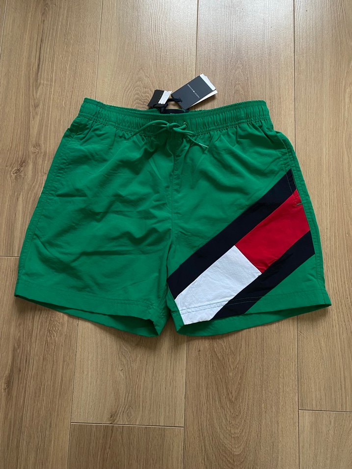 Kemerli, bol kesim erkek mayo şortu yeşil renkte olup, siyah, kırmızı ve beyazdan oluşan çapraz şerit detayı bulunur. Plaj ve sokak tarzı için uygundur.