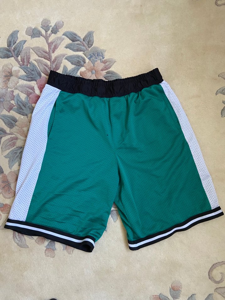 Nefes alabilen sentetik kumaştan yapılmış, kemerli bel kısmı siyah, yanları beyaz panelli koyu yeşil renkli bol kesim erkek spor şortu.
