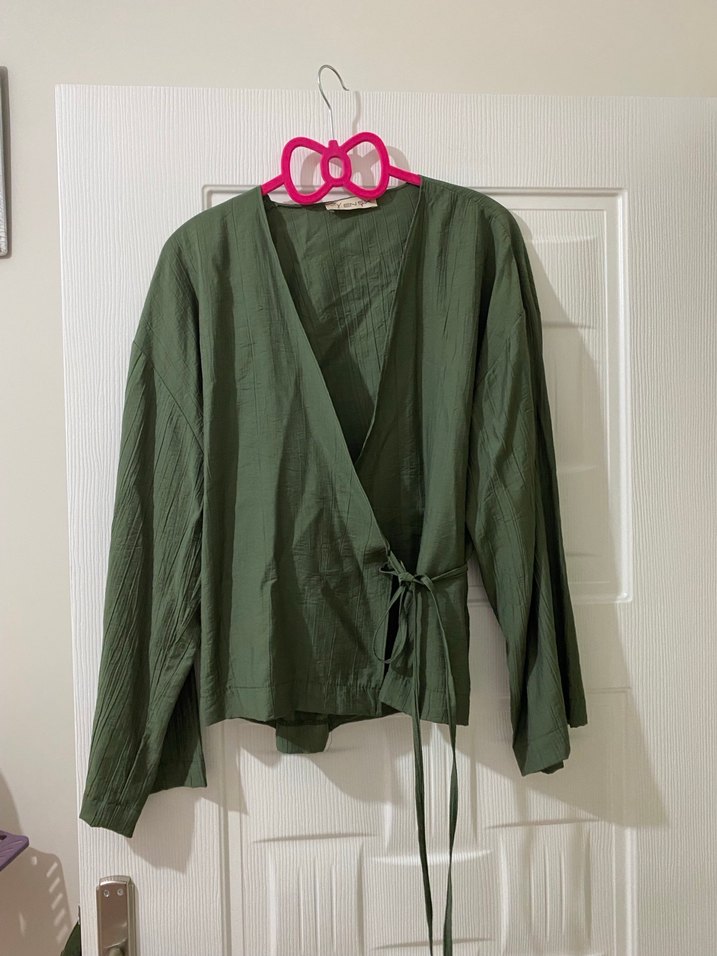 Uzun kollu, kemerli ve keten kumaştan yapılan bu yeşil kadın kimono, midi boyda ve rahat kesimdir. Minimalist tasarımı günlük sokak stiline uygundur.