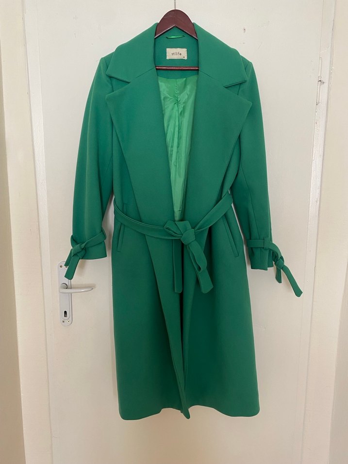 Kemerli ve askılı kollu yeşil uzun kaban, yumuşak kumaştan üretilmiştir. Ofis için uygun, klasik Paris tarzında, regular fit ve kesik yaka detaylıdır.