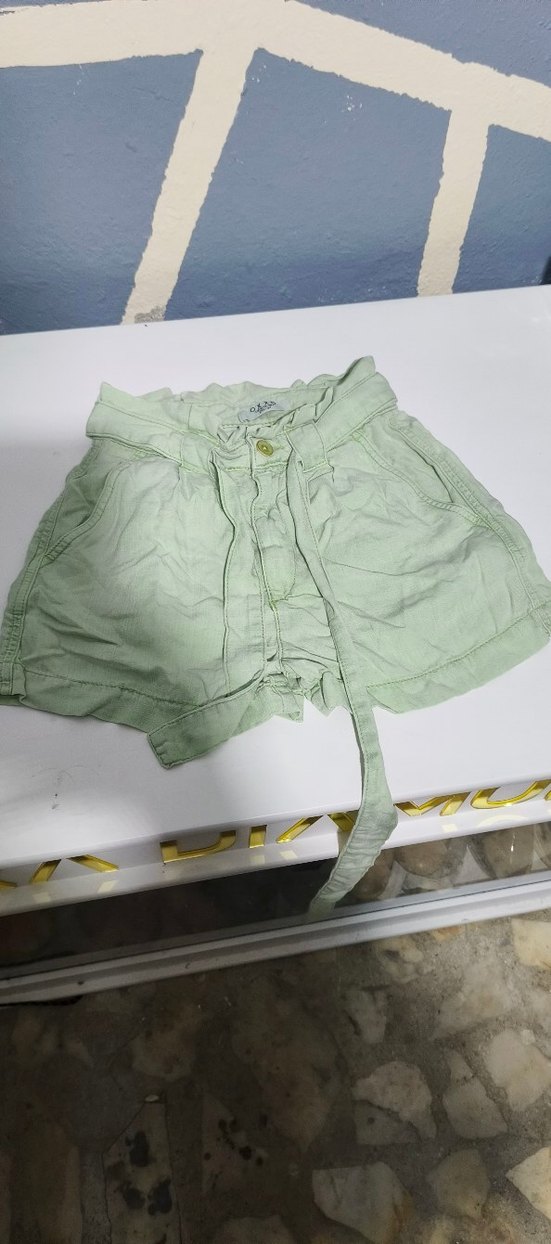 Hafif keten kumaştan, kemerli, bol kesim pastel yeşil kız şortu. Rahat ve günlük sokak stili için uygun.