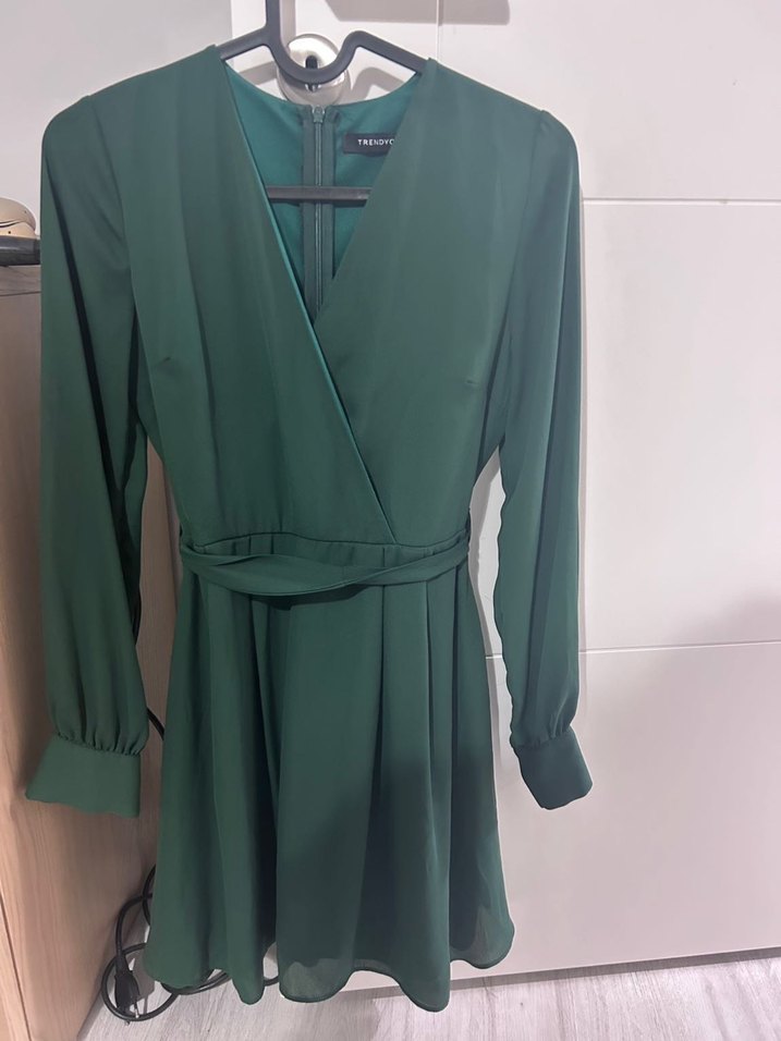 Kemerli bel, V yakalı ve uzun kollu yeşil midi elbise, modern klasik tarzda ve ofis kullanımı için uygun.