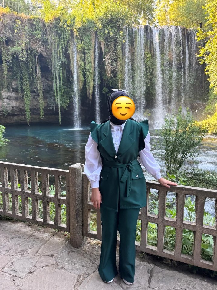 Kemerli, kolsuz, yeşil kadın takımı, normal boy pantolon ve sivri yaka detayına sahiptir. Sentetik kumaş ve bağlamalı tasarımla günlük kullanım için uygundur.
