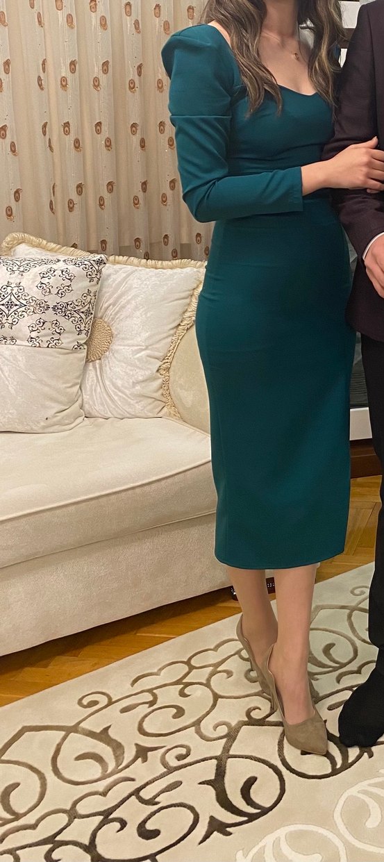 Kemer detaylı, V yaka ve ince askılı yeşil kalem elbise, sentetik yumuşak kumaştan midi boyda, modern klasik stil için uygundur.
