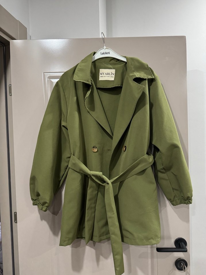 Kemerli bel ve kesik yaka detaylı, parlak yeşil sentetik kumaştan kısa mini trençkot. Strappy kollu, rahat kesim ve günlük kullanıma uygun.TAKAS YOK