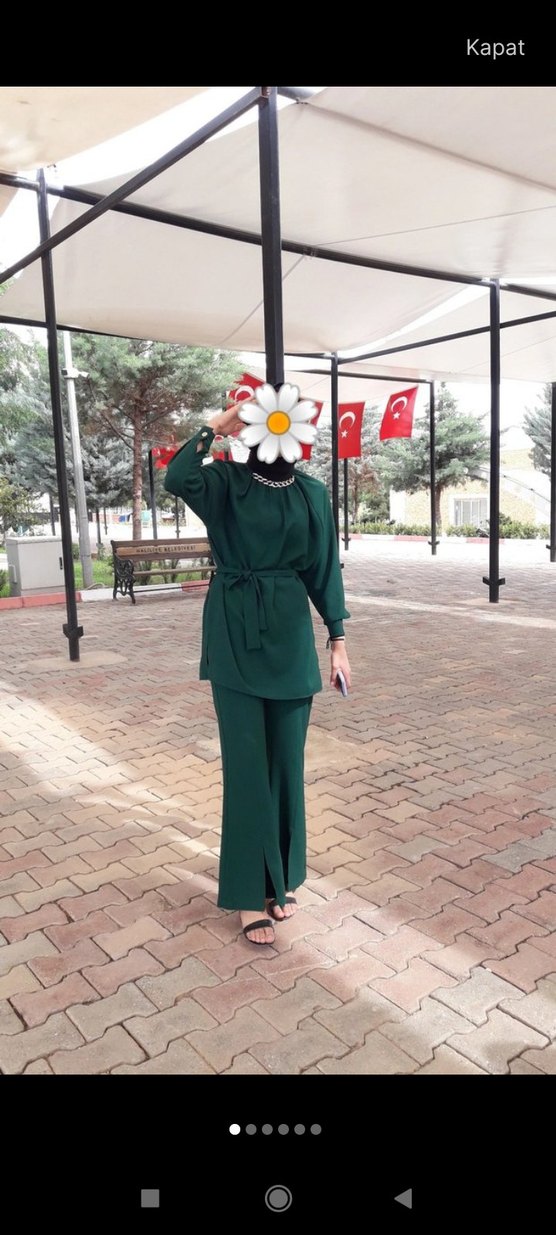 Kemerli, dik yakalı ve askılı kollu koyu yeşil kadın takımı. Sentetik kumaştan, çiçek desenli ve günlük kullanıma uygun sade tarzda.
