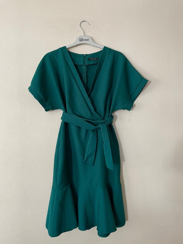 Koyu yeşil midi elbise, V yaka ve kısa kolludur. Kemer detaylı, rahat ve bol kesimdir. Minimalist ve modern ofis tarzına uygundur.