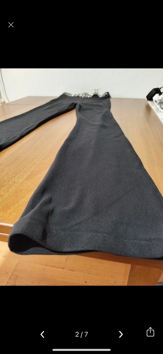 Kemeri çıkarıldı, siyah renkte, dar kesim ve uzun boyda kadın ispanyol paça pantolon, rahat sentetik kumaştan üretilmiştir.