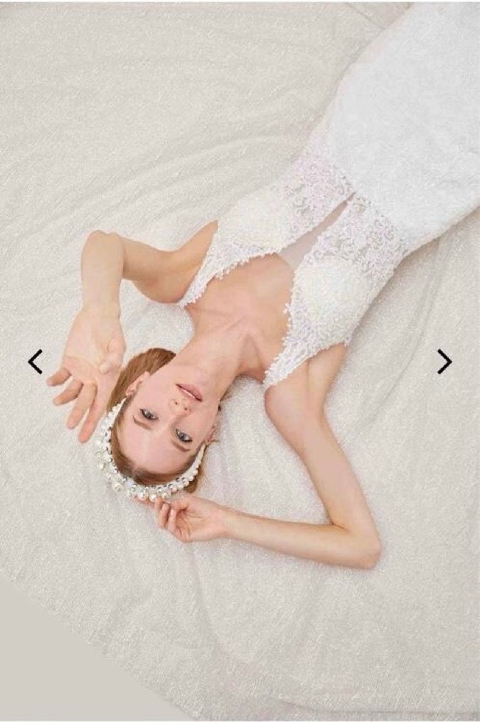 KEMİK RENGİ OLEG CASSİNİ 1.55 cm; 45 kg olan gelinimiz 8 cm topuklu ile giymiştir. ÜNLÜ GELİNLİK MAĞAZASI TASARIMLIDIR V yakalı, ince askılı ve dantelli detaylı uzun kuyruklu beyaz gelinlik, modern ve göz alıcı bir tasarıma sahiptir.