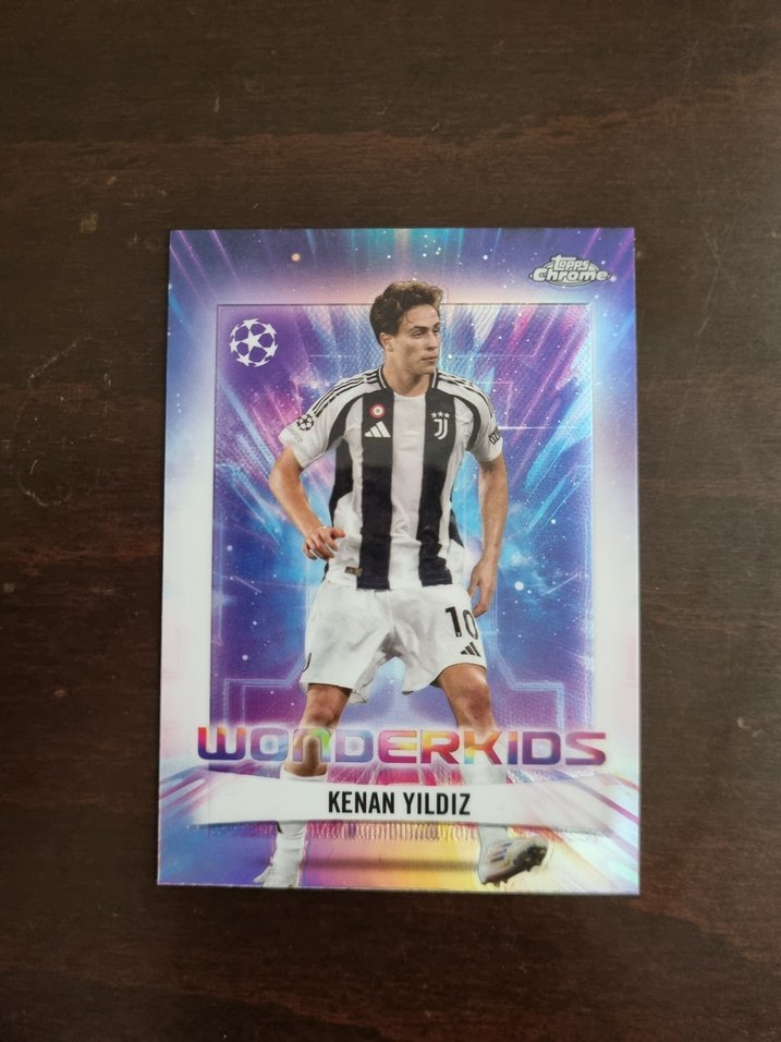 Kenan Yıldız'ın Juventus formasıyla yer aldığı, renkli holografik arka plana sahip Wonderkids futbol kartı. Canlı ve koyu renkli tasarım içerir ⚽️.