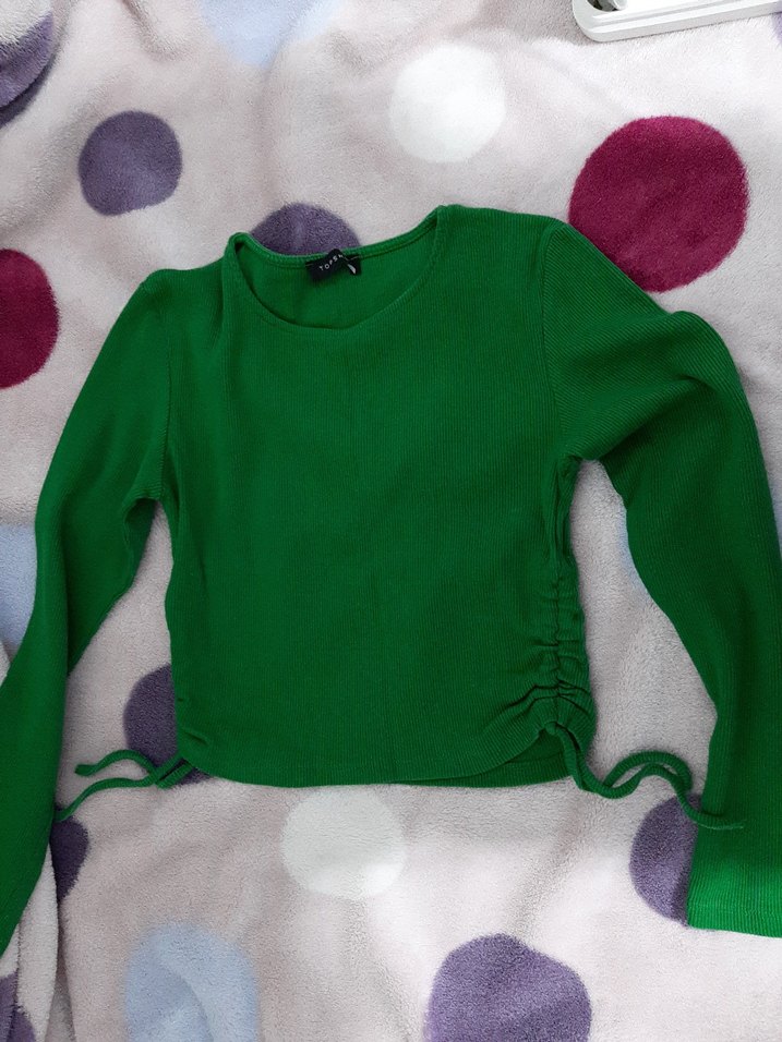 Kızlar için uzun kollu, fit kesim yeşil kazak. Yumuşak ve sıcak dokulu kumaştan örülmüş, sade tasarımlı ve yanlarda ayarlanabilir bağcıkları vardır.
