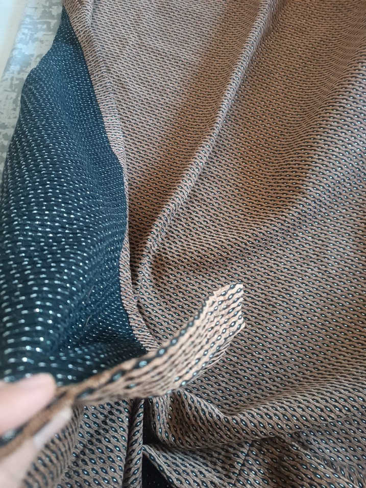 Koyu kahverengi, dokulu örgü yüzeye sahip desensiz, kalındır ve az kullanıldı biz perde olarak duvardan duvara kullandık ortada bı dikiş var acarsaniz fon perde olur