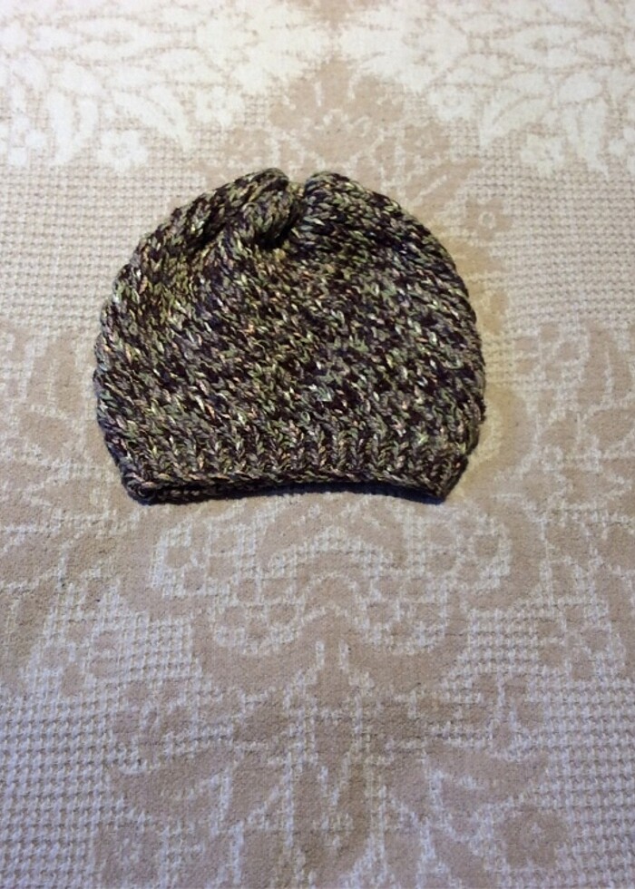 Dikişsiz sipiral örgü içinde küçük ışıltıları olan kahverengi ve yeşillerin olduğu çok şık bir şapka