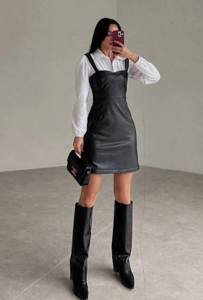 Sezonun en trend parçası! ✨ Suni deri askılı mini elbise, beyaz gömlek detayıyla zamansız bir şıklık sunuyor. Yandan fermuarlıdır.