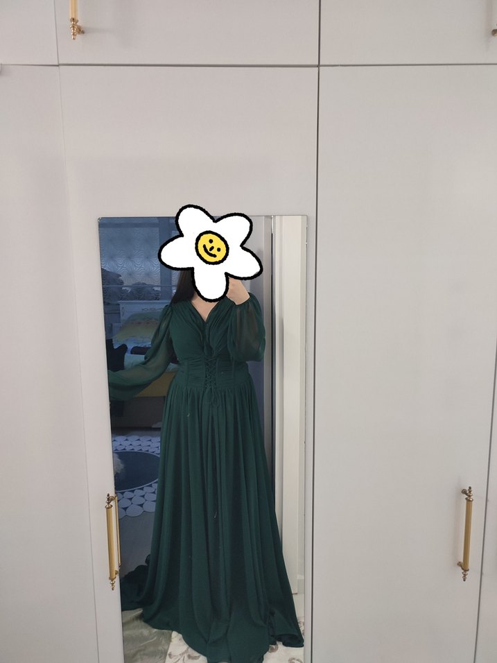 Bu uzun koyu yeşil elbise, drapeli tasarımı, korsesi, uzun kollu ve V yakası ile dikkat çeker. Sade ve avangart tarzlara uygundur. Ürün üzerinde tadilatlar yapıldı. Fiyatta yardımcı olmaya çalışırım. İlgilenenlere özel ölçülerini de iletirim. Ocak ayında ZeroPoint'den 6000 TL'ye almıştık. 42 beden ama 40-42 uyumlu.