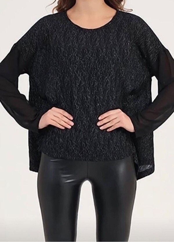 Kolları tül detaylı,kendinden simli,basen kısımları uzun,geniş kalıp bluz.L bedene de uyumludur.
