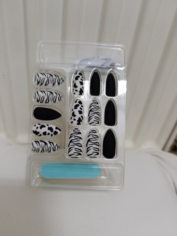 Misyul Profesyonel Stüdyo Tırnakları, siyah ve gri renklerde, çeşitli desenlerle 24 adet kendinden yapışkanlı takma tırnak Takıp çıkarılması kolaydır.