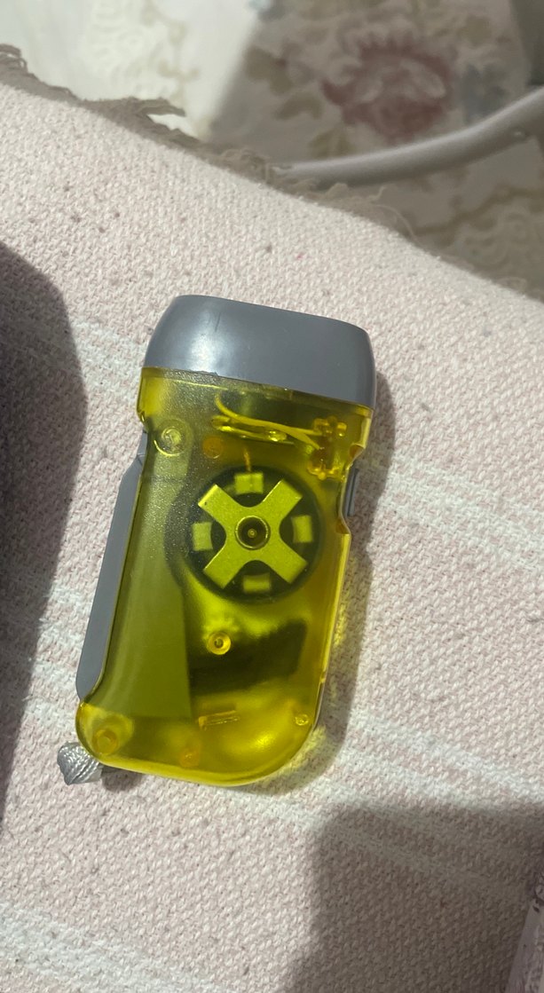 Sarı yarı saydam gövdesi ve gri üst kısmı olan, döner bıçak mekanizmasına sahip küçük en fenerimakinesi.