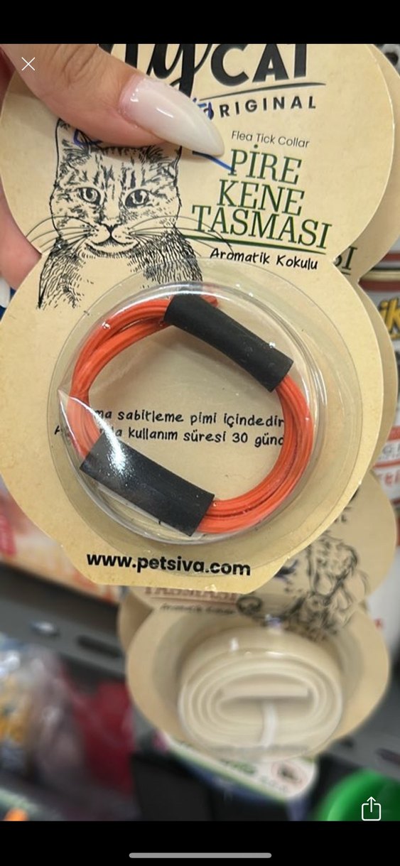 Turuncu renkli aromatik kokulu kene pire tasması, sabitleme pimi ile birlikte gelir ve kullanım süresi 30 gündür.