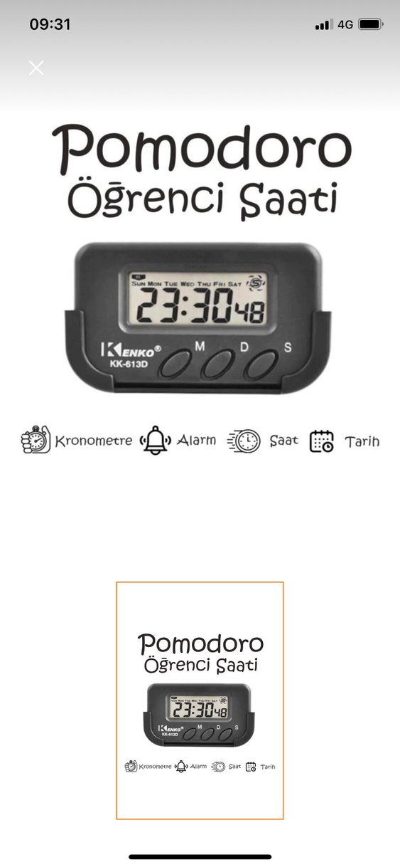 Kenko KK-613D dijital öğrenci saati koyu renkli olup kronometre, alarm, saat ve tarih fonksiyonlarına sahiptir. Pomodoro çalışma yöntemi destekler. ⏰