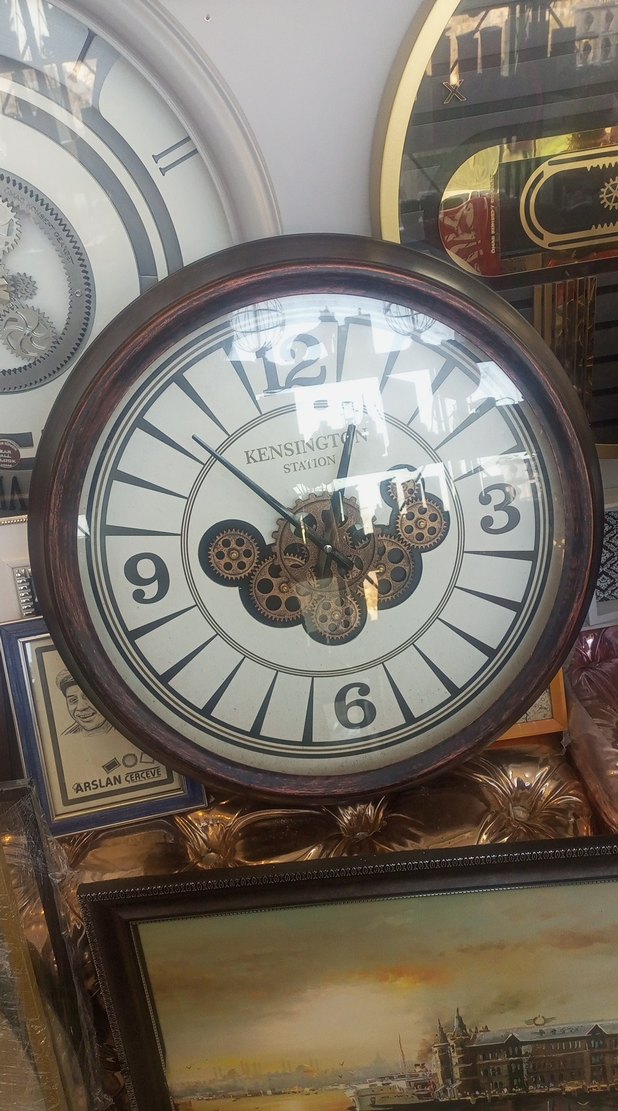 Koyu kahverengi çerçeveli duvar saati, büyük 3, 6 ve 9 rakamları ve dişli detaylarıyla vintage tarzda. Saat yüzünde 'KENSINGTON STATION' yazısı bulunur. ️