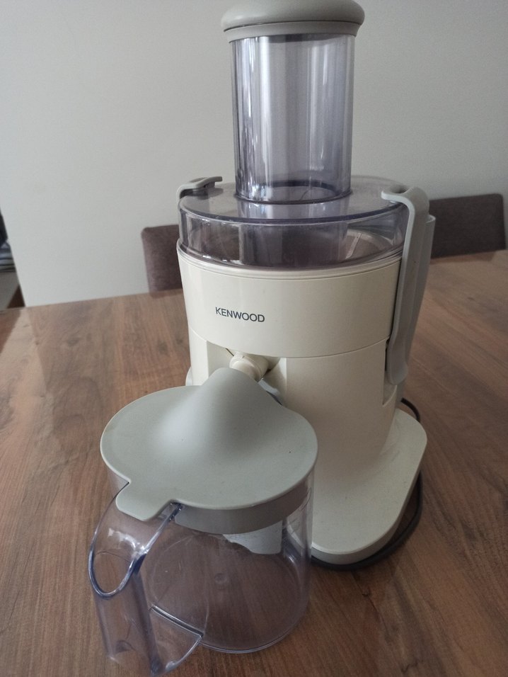 Kenwood markalı beyaz ve gri renkli katı meyve sıkacağı, şeffaf meyve suyu haznesi ile kolay kullanım sağlar.
