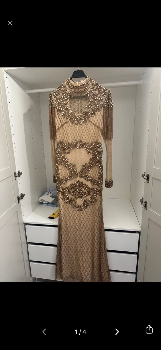 Boncuk işlemeli desenleri ve yüksek yakasıyla bej uzun abiye elbise. İnce askılı, vücuda oturan bohem ve avangart tarzda, düğünler için uygun. ✨40 beden yazıyor fakat ben 36 ile giydim iç badi kullandım
