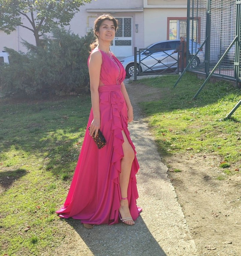 Pembe, parlak kumaştan uzun, drapeli ve bol kesim abiye elbise. Straplez yaka ve ince askılı, baskılı desene sahip, düğünler için uygun. Sadece 2 saat giyildi.
