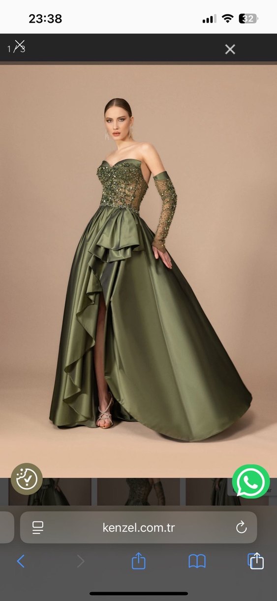 Şık nakış detaylı, straplez yakalı ve bol kesimli haki uzun abiye elbise. Dökümlü tasarımı ve kolsuz yapısıyla düğünler için uygundur. ✨