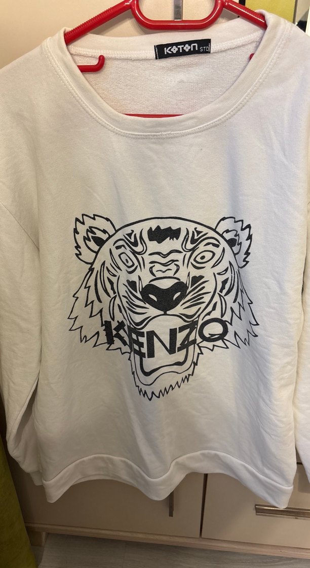 Beyaz, bol kesim, yuvarlak yakalı ve uzun kollu kadın sweatshirtü. Üzerinde Kenzo logosu ve baskılı kaplan deseni bulunur. Yumuşak sentetik kumaştan, günlük kullanım için uygundur.
