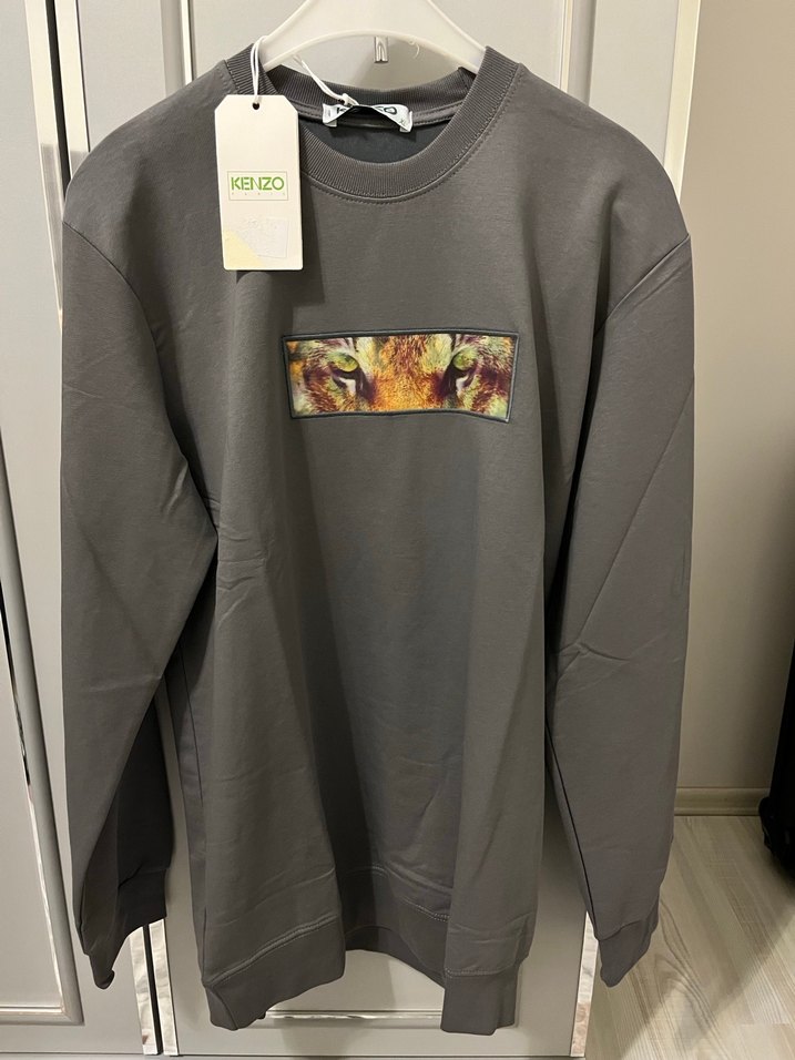 Kenzo marka, uzun kollu, bisiklet yaka, bol kesim gri sweatshirt. Önünde baskılı kaplan gözü deseni bulunur. Rahat ve günlük kullanıma uygundur.