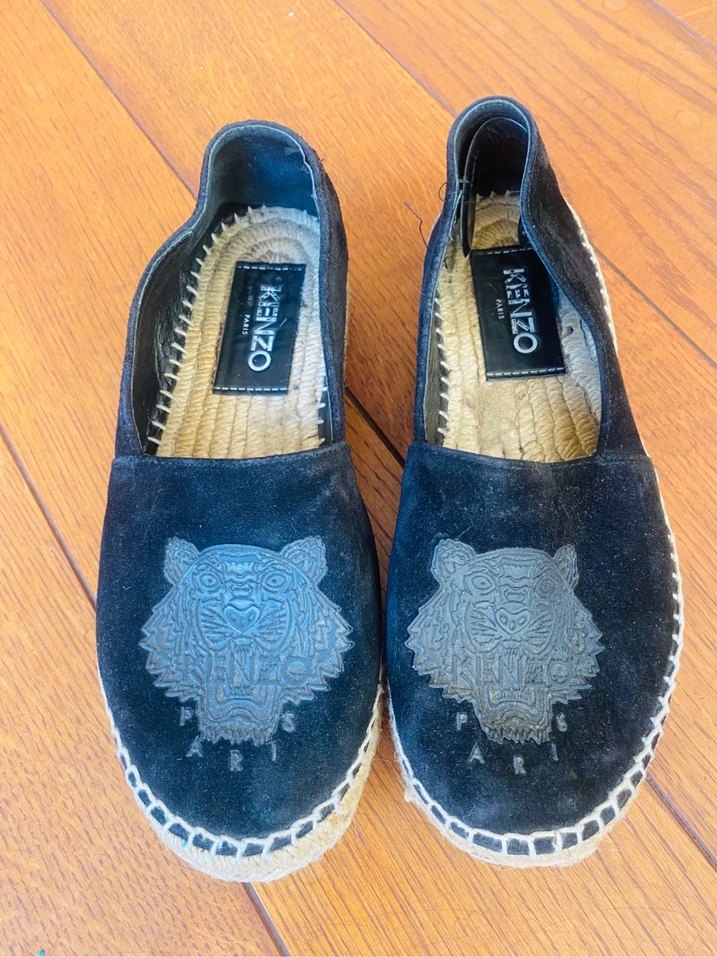 Kenzo markalı süet kadın espadril, dolgu topuklu, nakışlı kaplan desenli ve kürk detaylı, günlük rahat kullanım için uygun. 37 numara.