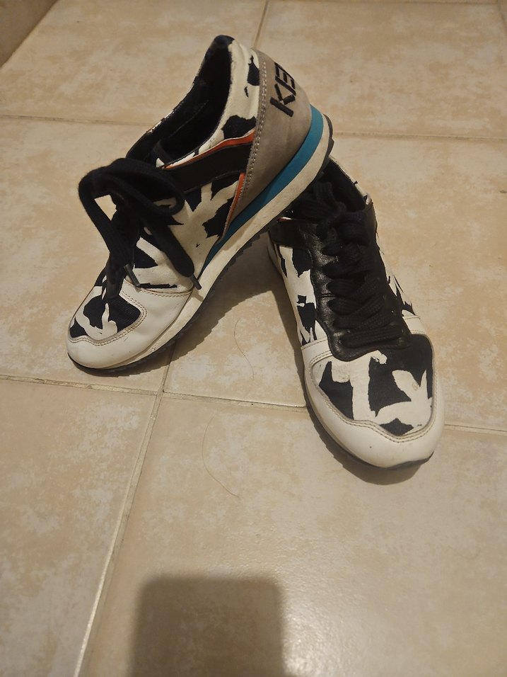 Kenzo marka siyah beyaz kadın spor ayakkabısı, slim topuk ve desenli. taban sağlam bilek kısmında hafif deforme var