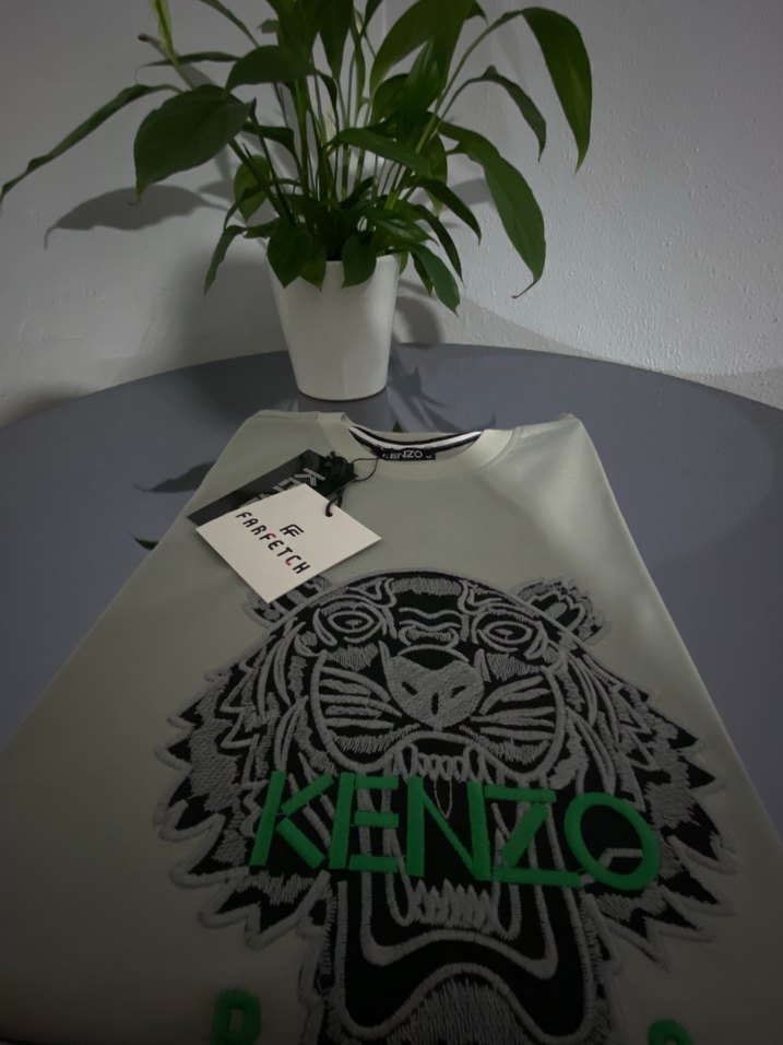 Önü büyük yeşil kaplan nakışlı, yeşil Kenzo logosu bulunan beyaz sweatshirt. Yumuşak kumaş, yuvarlak yaka.